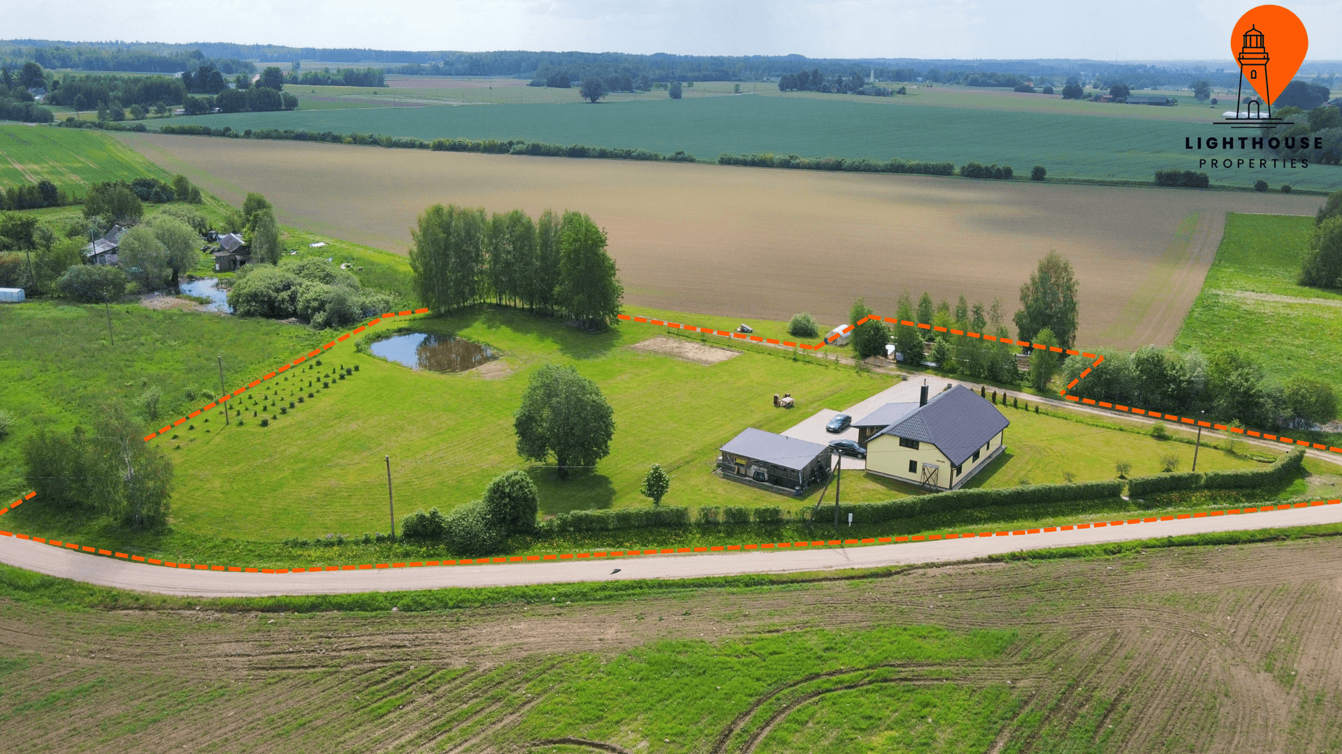 Dzīvojamās mājas pirmajā stāvā izvietota plaša dzīvojamā istaba, kas apvienota ar virtuvi, trīs guļamistabas, divas vannas istabas, tualete, garāžas telpa kurā izvietota apkures iekārta. Mājas otrajā stāvā veikti visi nepieciešamie renovācijas darbi izņemot grīdas seguma uzklāšanu. Īpašuma teritotija ir labiekārtota un izcili piemērota klusas un mierīgas lauku vides baudīšanai mājas iemītniekiem.